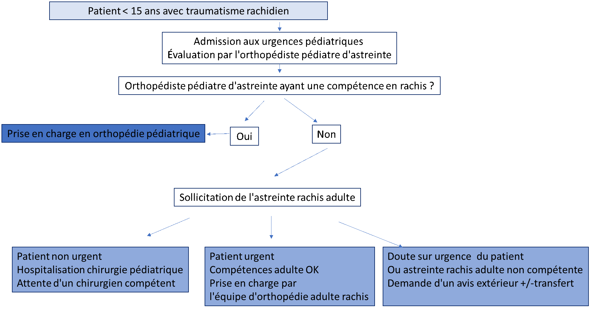 - Nécessité de clarifier la prise en charge des enfants suspects de lésions rachidienne : action corrective entreprise en amont de la RMM avec élaboration par l'équipe référente d'un algorithme de décision pour ces enfants (Figue 1 ci-dessous). En résumé, la destination préférentielle reste le trauma center pédiatrique du CHU de Rennes, et le chirurgien orthopédique pédiatrique a la charge de rechercher et de transmettre l'avis chirurgical approprié.